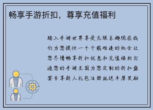 踏入手游世界,享受无限乐趣!现在,我们为您提供一个千载难逢的机会,让您尽情畅享折扣优惠和充值福利,打造您的手游王国!