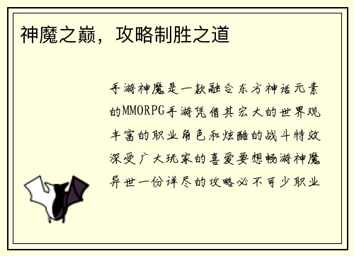 手游《神魔》是一款融合东方神话元素的MMORPG手游,凭借其宏大的世界观、丰富的职业角色和炫酷的战斗特效,深受广大玩家的喜爱。要想畅游《神魔》异世,一份详尽的攻略必不可少。